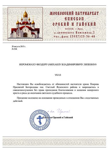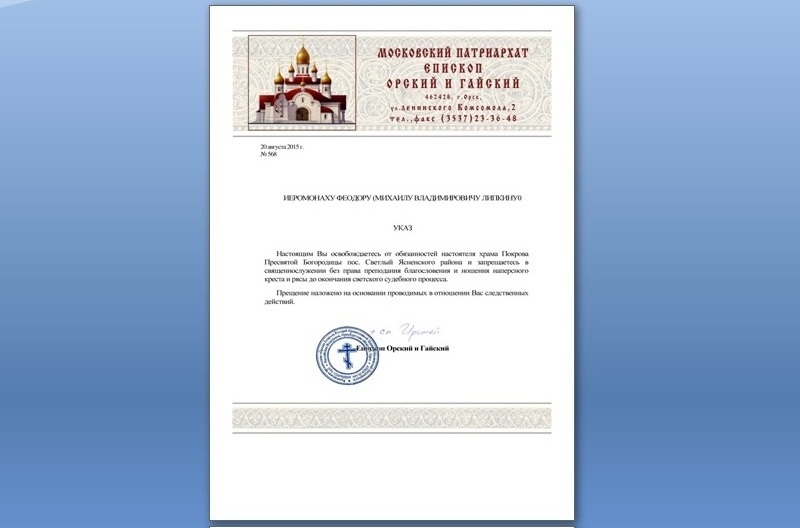 В связи с предъявленными обвинениями следственных органов в адрес клирика Орской епархии иеромонаха Феодора (Михаила Владимировича Липкина), настоятеля храма Покрова Пресвятой Богородицы пос. Светлого, данный клирик запрещается в священнослужении до окончания следственного процесса и выяснения всех обстоятельств дела.
