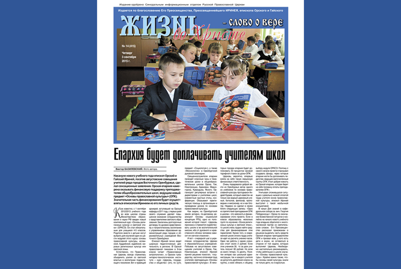 Номер открывает материал Виктора Базилевского «Епархия будет доплачивать учителям школ». Накануне нового учебного года епископ Орский и Гайский Ириней, посетив августовские совещания учителей ряда городов Восточного Оренбуржья, сделал сенсационные заявления. Орская епархия намерена оказывать финансовую поддержку преподавателям общеобразовательных школ, ведущим новый предмет «Основы православной культуры» (ОПК). Значительная часть финансирования будет осуществляться епископом Иринеем из его личных средств.