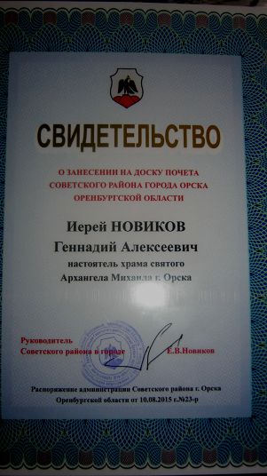 В этом юбилейном году на доску Почёта Советского района г.Орска занесли названия производственных предприятий, образовательных учреждений, учреждений социальной защиты, а также фотографии трех десятков орчан. В номинации «Лучший житель района, прославивший себя благородным поступком» было вручено свидетельство иерею Геннадию Новикову – руководителю епархиального Миссионерского отдела, настоятелю храма Святого Архангела Михаила г. Орска, руководителю Воскресной школы «Архангел Михаил».