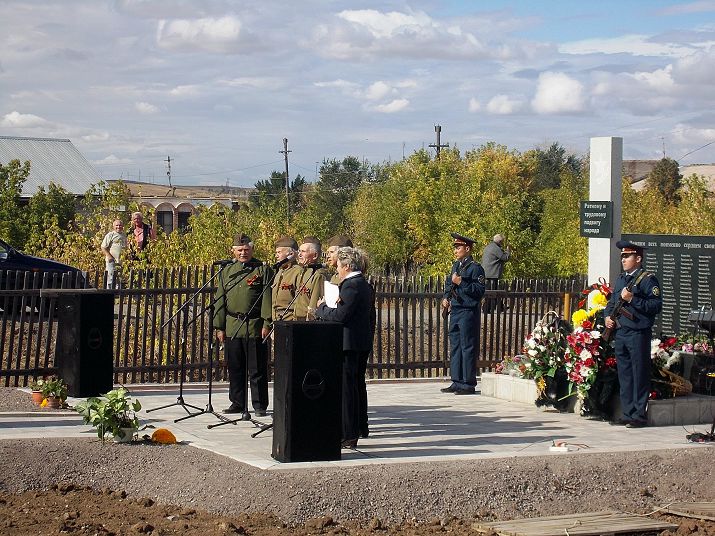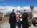 Благочинный Новотроицкого округа, настоятель собора святых апостолов Петра и Павла г. Новотроицка протоиерей Сергий Кваша, в сослужении настоятеля храма Святой преподобномученицы великой княгини Елизаветы ст. Губерля г. Новотроицка иерея Никиты Кваши, совершил чин освящения памятника павшим воинам.