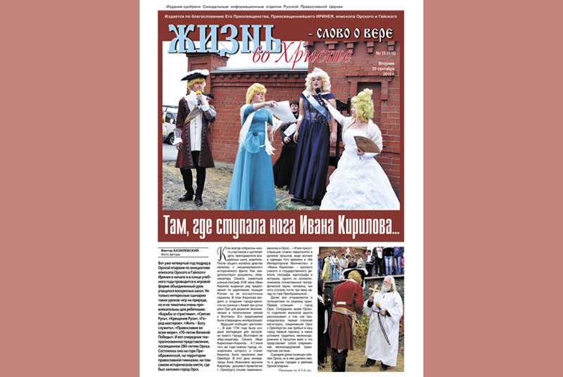 С наиболее важными событиями в Орской епархии знакомит рубрика Епархиальная жизнь: на купол восстанавливающегося старинного храма пророка Божия Илии в селе Ильинке Кувандыкского района водружен крест; лучшим студентам Орского гуманитарно-технологического института и Новотроицкого политехнического колледжа вручены свидетельства о назначении архиерейской стипендии на первое полугодие учебного года; благочинный Орского округа протоиерей Александр Куцов и матушка Наталья Антипова награждены юбилейными медалями «В память 1000-летия преставления равноапостольного великого князя Владимира»; прихожанами храма св. ап. Андрея Первозванного с. Хабарного и часовни св. вмч. и целителя Пантелеимона г. Новотроицка была организована благотворительная акция «Соберём ребенка в школу». Здесь же информация о преподавательской деятельности епископа Орского и Гайского Иринея; об окормлении воспитанников Гайского детского дома-интерната для умственно отсталых детей протоиереем Сергием Барановым и рассказ протоиерея Симеона Антипова о воскресной школе Кувандыка с просьбой о финансовой помощи для строительства здания воскресной школы.