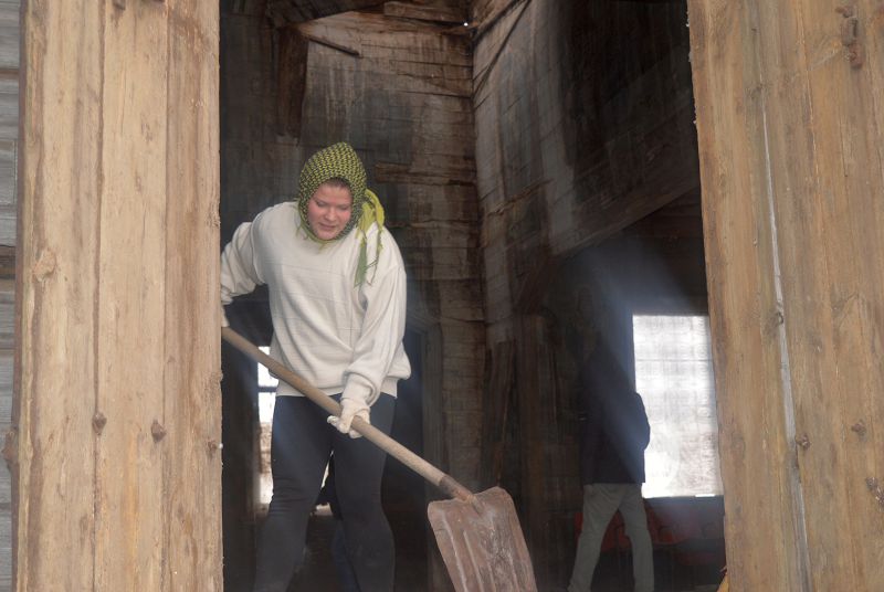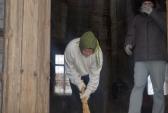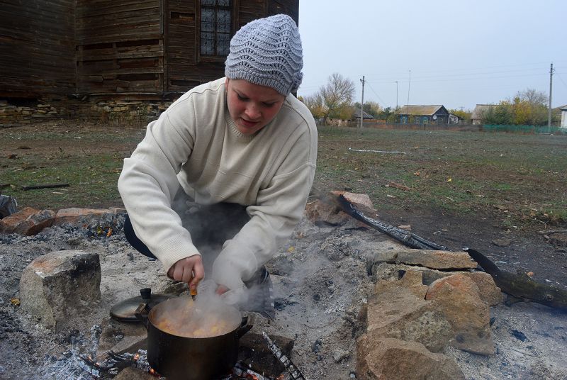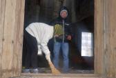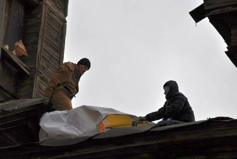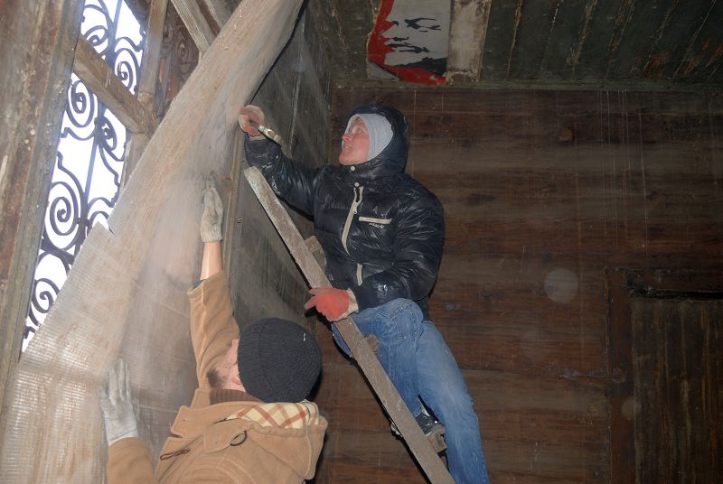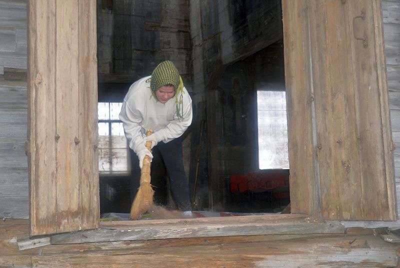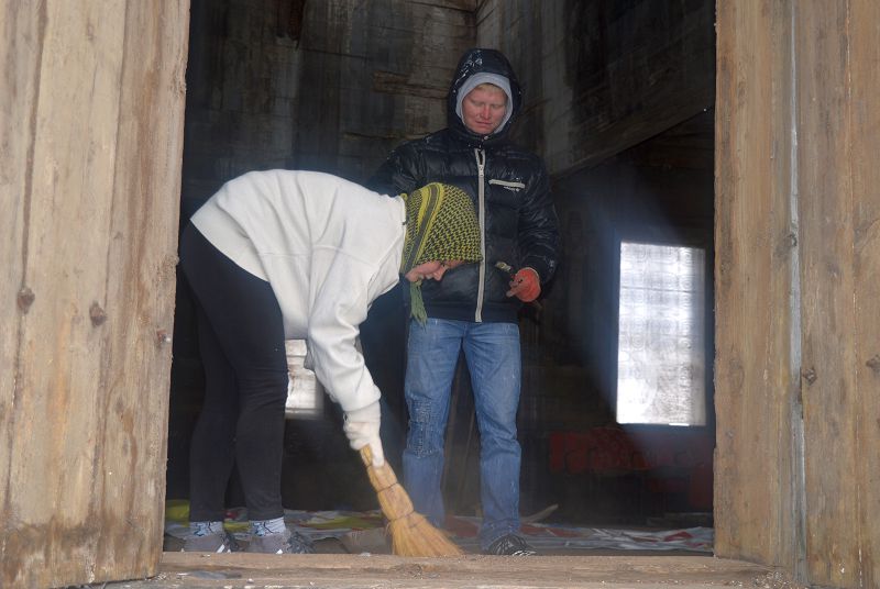 Прибыв на место, каждый занялся своими делами. Девушки сначала взяли метла и лопаты, прибрав Покровский храм, а затем дружненько начали готовить обед. А мужчины в это время мужственно сражались на крыши с ветром и снегом, чтобы перекрыть и утеплить крышу. Но погодные условия не позволили это сделать и строительный метариал (баннеры) был передан старосте этого села. Она пообещала, что на следующей недели они с местными жителями обязательно перекроют крышу.