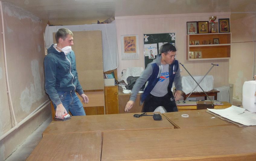Первую неделю вместе с прихожанами они расчищали стены, готовя их к грунтовке и покраске. Ремонтировали помещение для занятий в воскресной школе всем миром, понимая, что ученикам должно быть комфортно и уютно на занятиях в церкви. На время ремонта занятия шли в храме, что неудобно и для учеников, и для прихожан.