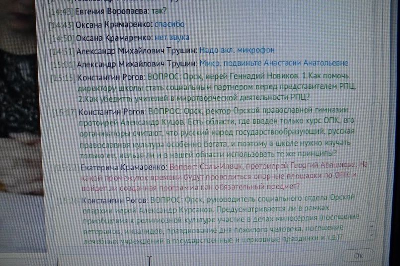 В ходе видеобеседы обсуждались особенности преподавания основ православной культуры в школах Оренбургской области. Участники вебинара от Орской епархии задали несколько вопросов о возможности добровольного выбора родителями именно того предмета, который действительно интересен их детям. Кроме того, ректор Орской православной гимназии протоиерей Александр Куцов предложил использовать при выборе данного курса опыт тех епархий, в которых основы православной культуры уже преподаются традиционно. Было замечено, что при ближайшем рассмотрении данный вопрос требует вдумчивого подхода, о котором также упоминали собравшиеся.