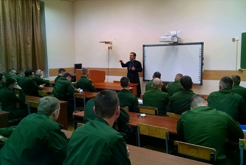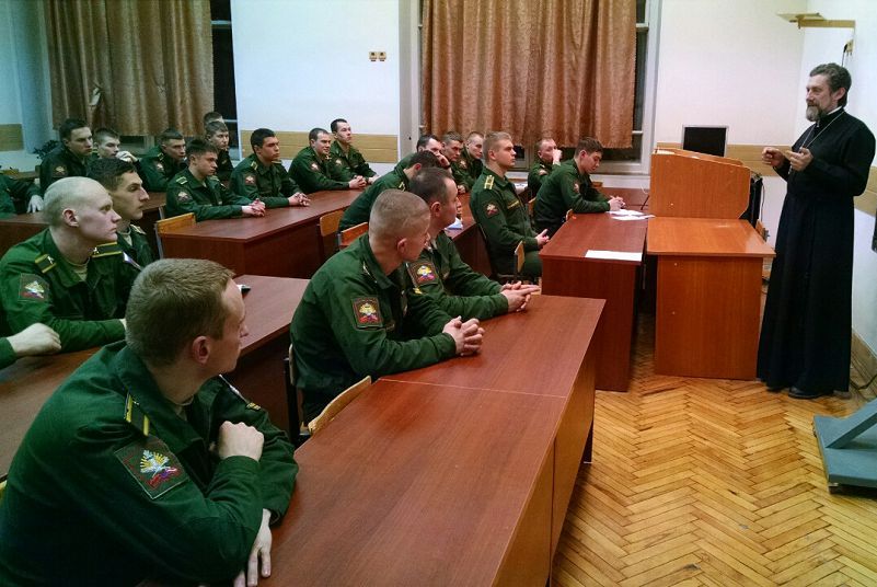 Помощник начальника Военного университета Министерства обороны по работе с верующими военнослужащими протоиерей Димитрий Солонин во внеучебное время проводит беседы с курсантами различных факультетов в рамках исполнения должностных обязанностей и утверждённых командованием тем.