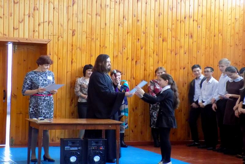 На школьной линейке настоятель храма Покрова Пресвятой Богородицы пос. Светлого иерей Михаил Рябинов вручил ребятам грамоты за участие в школьной научно-практической конференции, посвященной тысячелетию со дня преставления святого равноапостольного князя Владимира. Конференция прошла 26 ноября 2015 года.