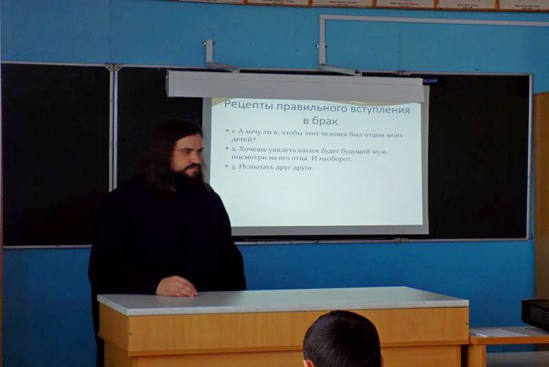 СВЕТЛЫЙ. 16 декабря 2015 г. Настоятель храма в честь Покрова Пресвятой Богородицы пос. Светлого иерей Михаил Рябинов провел беседу с учениками 9 класса Актюбинской общеобразовательной школы.