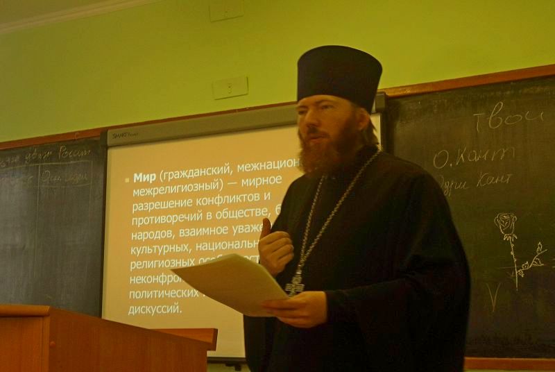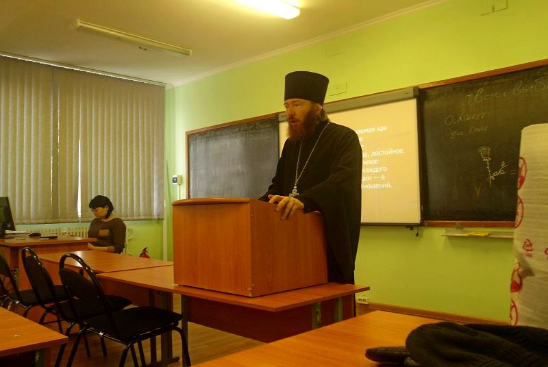ОРСК. 16 декабря 2015 г. По благословению епископа Орского и Гайского Иринея руководитель миссионерского отдела Орской епархии иерей Геннадий Новиков провел лекцию для студентов на тему: «Всемирный Русский Народный Собор. Базисные ценности как основа общенациональной идентичности».
