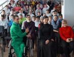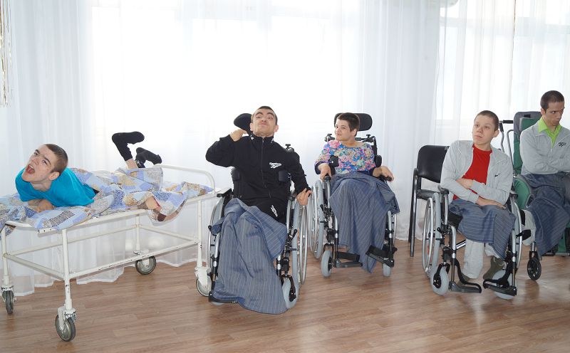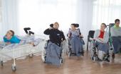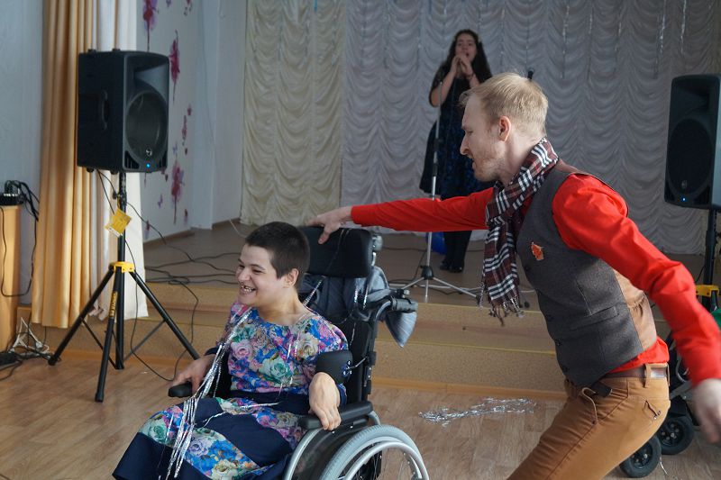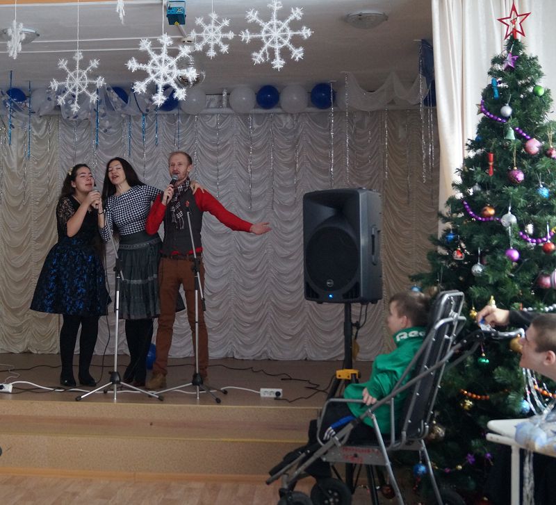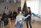 Главными героями праздника были дети-колясочники из отделений милосердия. Тяжелые формы заболеваний – совсем не повод не покидать помещения, в которых они проживают, чтобы повеселиться наравне со всеми. Поэтому гости помогли добраться детям в актовый зал, где их ждала нарядная елка и веселое развлечение.