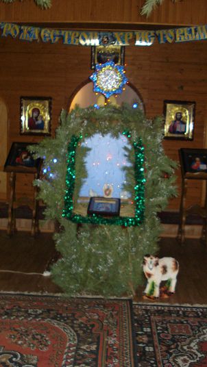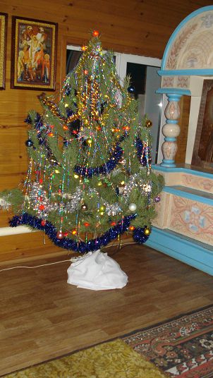 Прихожане и работники храма внесли свою лепту украсив пещеру-вертеп живыми ветвями сосны, легким искусственным снежком и светящими гирляндами. Установили и нарядили елку в храме и во дворе.