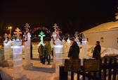 Посетители ледового городка любуются Вифлеемской звездой, прозрачными башенками, светящимся семисвечником, аналоем с праздничной иконой и большим восьмиконечным крестом. Весь сказочный городок находится в окружении арок из разноцветных огней.и Остается положиться на милость природы и верить, что погода позволит этому красивейшему ажурному арт-объекту простоять как можно дольше.