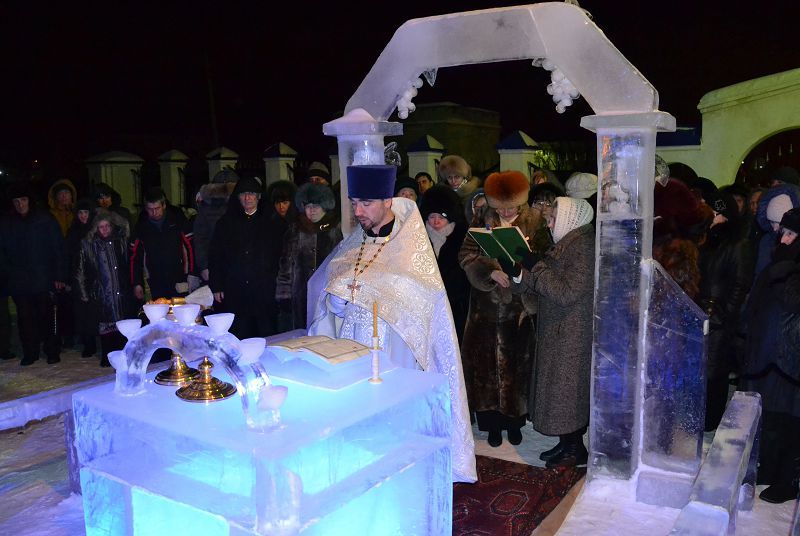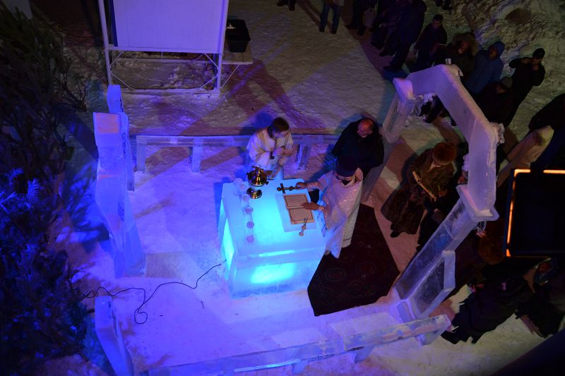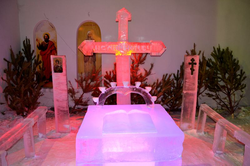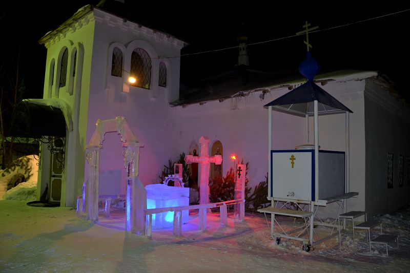 Традиционные достопримечательности прихода – построенные изо льда церковь, крест и престол – в морозную ночь создали необычную, проникновенную торжественность.