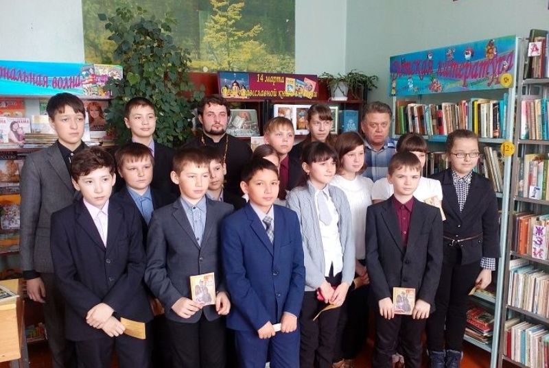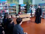 МЕДНОГОРСК. 14 марта 2016 г. В День православной книги настоятель храма святителя Николая Чудотворца (микрорайона Южного) иерей Максим Малюта провел встречу-урок с учащимися 4-8-х классов медногорской школы № 7 в детской библиотеке района Машиностроителей.