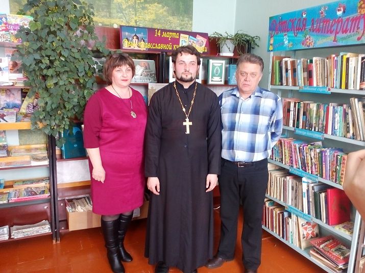Здесь была представлена выставка православной литературы, находящейся в фонде медногорской библиотеки. Священник рассказал об истории русского книгопечатания и о первом печатном издании на Руси – книге «Апостол». Также отец Максим на примере литературных произведений русской классики показал значимость православного мировоззрения для великих русских писателей.