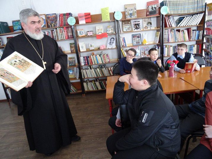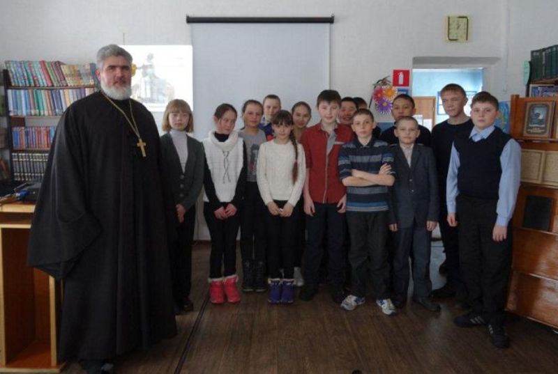 АДАМОВКА. 14 марта 2016 г. Благочинный Адамовского округа иерей Вячеслав Кочкин провёл встречу со школьниками в районной детской библиотеке.