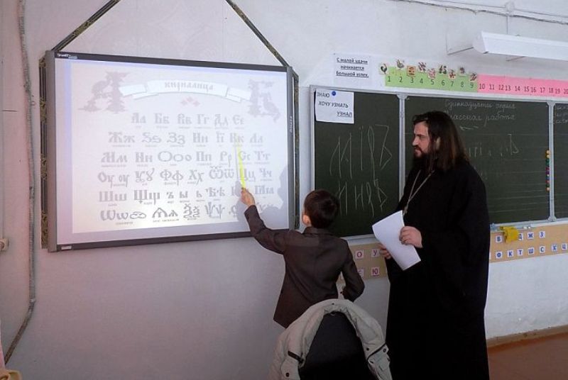 Священник рассказал ребятам о славянской азбуке – кириллице, объяснил название и значение многих входящих в неё букв. Узнали школьники и смысл выражения, которое получается, если перевести на русский язык названия букв азбуки: аз, буки, веди, глагол, добро. Как отметил отец Михаил, в кириллице записан генетический код славян, при забвении, утрате которого русская нация распадётся.