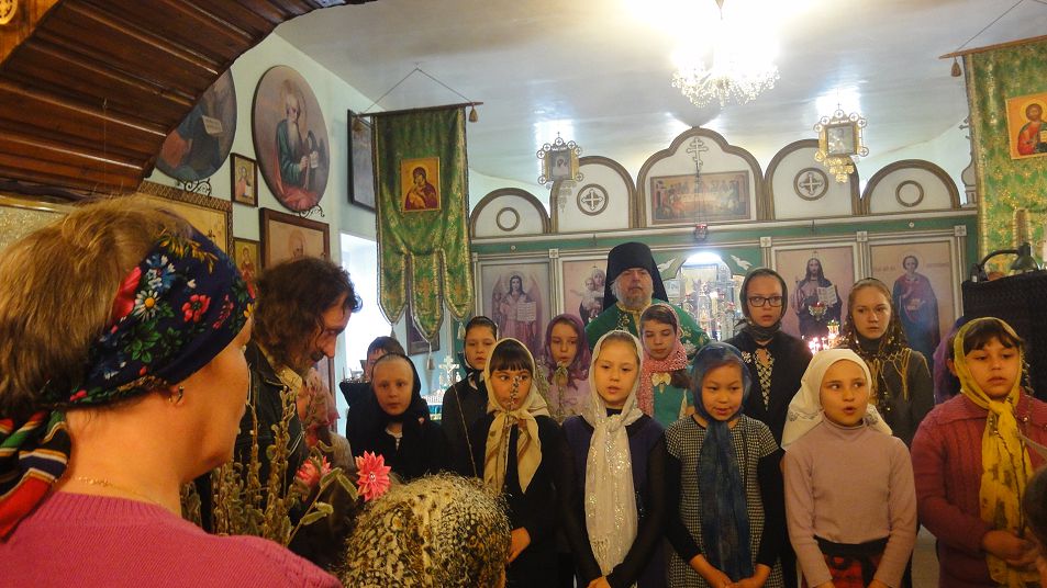 Пока прихожане три дня отмывали потолки и стены от копоти, чистили подсвечники и церковную утварь, внизу, в приходской библиотеке, ученики воскресной школы с учителем В.Н. Ждановой готовили выступление для жителей Ясного на Вербное воскресенье.