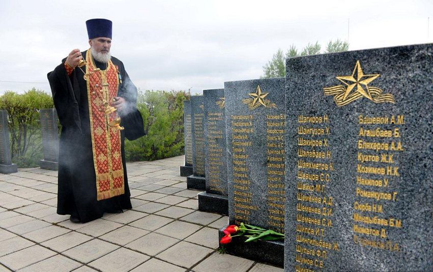 От храма верующие крестным ходом прошли по улицам Адамовки к парку Победы. Здесь у памятника погибшим на войне иерей Вячеслав Кочкин отслужил панихиду.