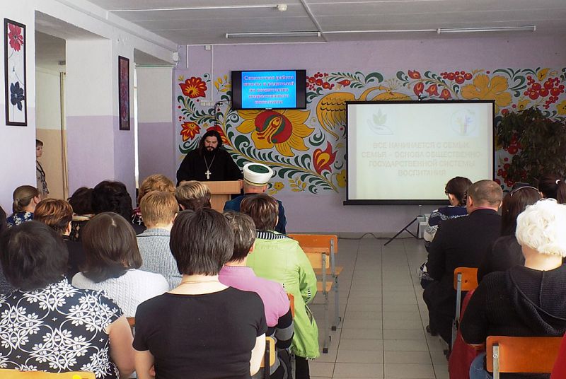 СВЕТЛЫЙ. 17 мая 2016 г. Настоятель храма в честь Покрова Пресвятой Богородицы пос. Светлого иерей Михаил Рябинов принял участие в совещании по вопросам воспитания подрастающего поколения в Светлинской общеобразовательной школе № 2.