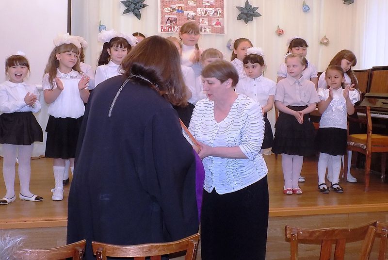 В «храм искусств» священник пришёл не с пустыми руками. За последние месяцы налажено сотрудничество прихода с учреждением дополнительного образования. Как результат – учащиеся и педагоги ДМШ участвовали в проходившем в храме в период Великого поста музыкальном вечере, а младший и старший хоры школы (руководители – Ю.Н. Заливан и В.С. Семёнова) выступили на организованном приходом пасхальном гулянии. Выражая музыкантам свою признательность, иерей Михаил Рябинов вручил директору школы О.И. Хлыстовой и руководителям двух хоров благодарности.