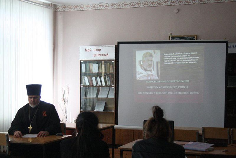 АДАМОВКА. 16 мая благочинный Адамовского округа иерей Вячеслав Кочкин прочитал доклад для студентов бухгалтерского отделения Адамовского сельскохозяйственного техникума «Добровольные пожертвования жителей Адамовского района во время Великой Отечественной войны». Встреча проходила в рамках курса «История родного края». В докладе на основе архивных данных было показано, что труженики тыла порой совершали невозможное: при увеличенных с началом войны налогах, нормах выработки и планах заготовок, они могли отдать для Победы последнее, и, кажется, даже больше этого.