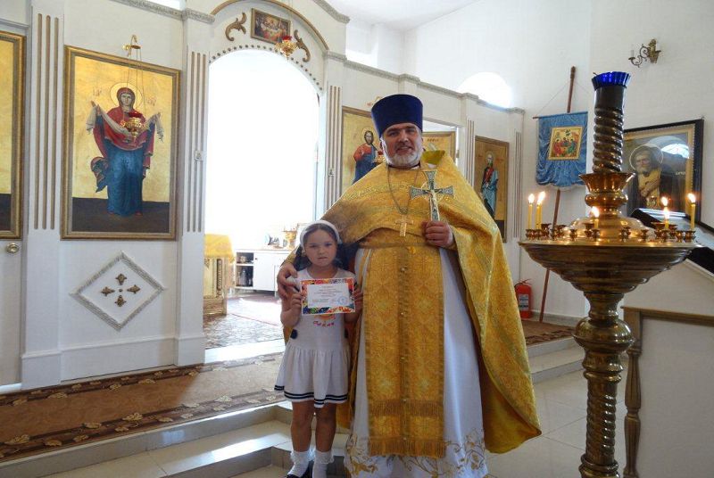 По окончании богослужения священник Вячеслав вручил сертификат и ценный подарок Арине Мухтаровой за активное участие в регионарном этапе ХХIV международного конкурса «Красота Божьего мира»