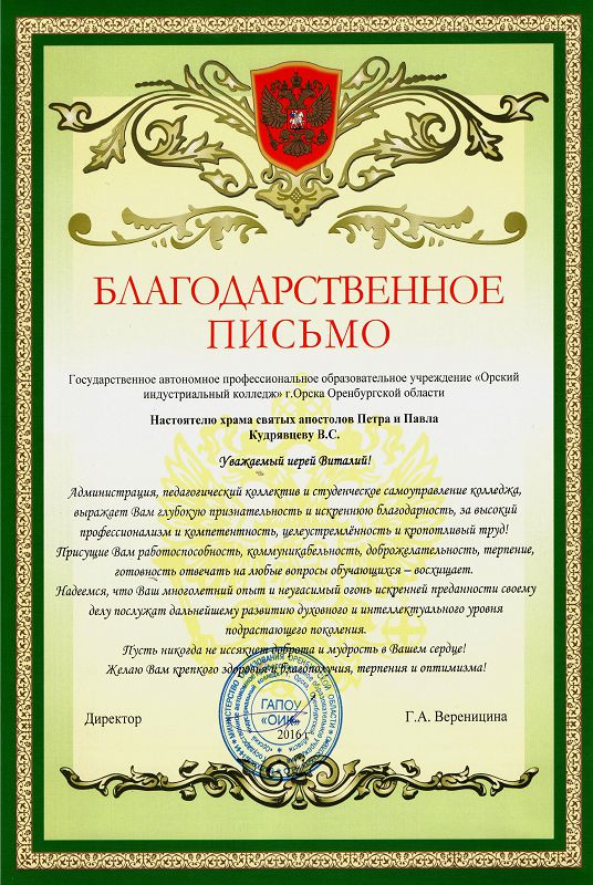 ГАЙ. 27 июня 2016 г. Настоятель храма святых апостолов Петра и Павла иерей Виталий Кудрявцев был приглашен на торжественную линейку в Гайский филиал Орского индустриального колледжа.