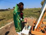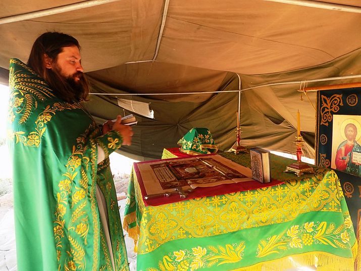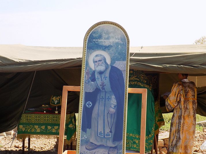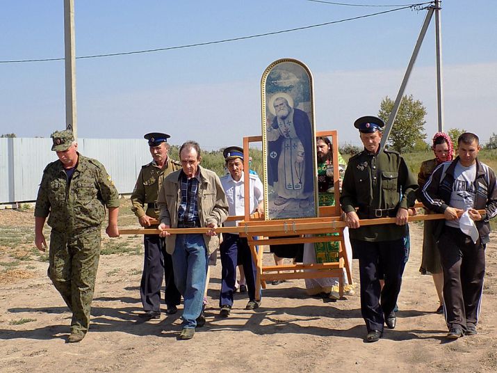 И вот, спустя годы, здесь вновь зазвучали богослужебные песнопения. По инициативе отца Михаила силами казаков место бывшего храма было, насколько это возможно, расчищено от хлама, над ним установлен навес, который послужил алтарём. И в день памяти великого саровского чудотворца здесь была отслужена Божественная литургия. За богослужением молились жители посёлка Целинного и представители хуторского казачьего общества «Рудный клад». Многие из молившихся причастились Святых Христовых Таин.
