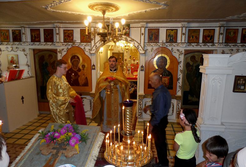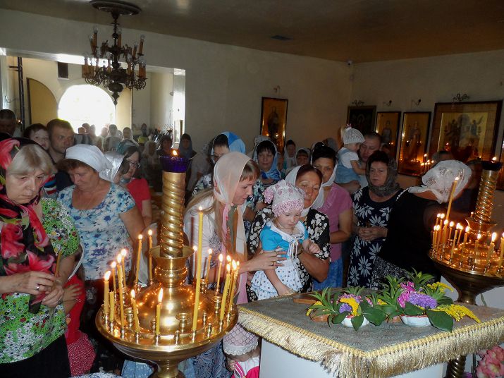 Богослужения совершил настоятель храма иерей Виталий Кудрявцев. Вечернее богослужение и литургия 13-14 августа, предваряющие Успенский пост, посвящены трем праздникам: Происхождению Честных Древ Животворящего Креста Господня; празднеству Всемилостивого Спаса и Пресвятой Богородицы; семи мученикам Маккавейским.