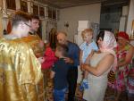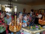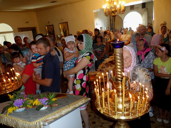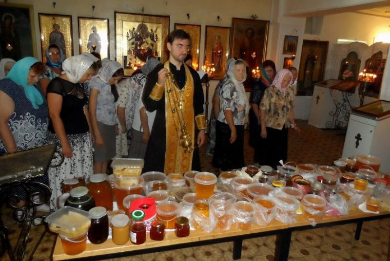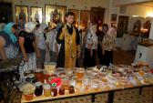 После Литургии по уставной традиции батюшка совершил чин малого освящения воды и освятил новый урожай меда, и в честь медового Спаса окропил собравшихся святой водой.