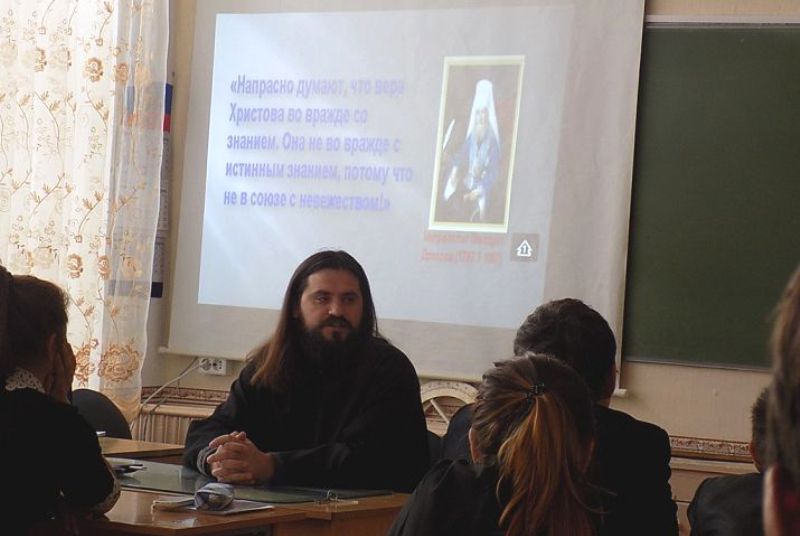 Священник рассказал детям и о том, что наука не противоречит религии, просто обе эти сферы рассматривают бытие через разные призмы: одна – через призму естественного опыта, другая – через опыт духовный. В завершении беседы отец Михаил ответил на вопросы школьников.