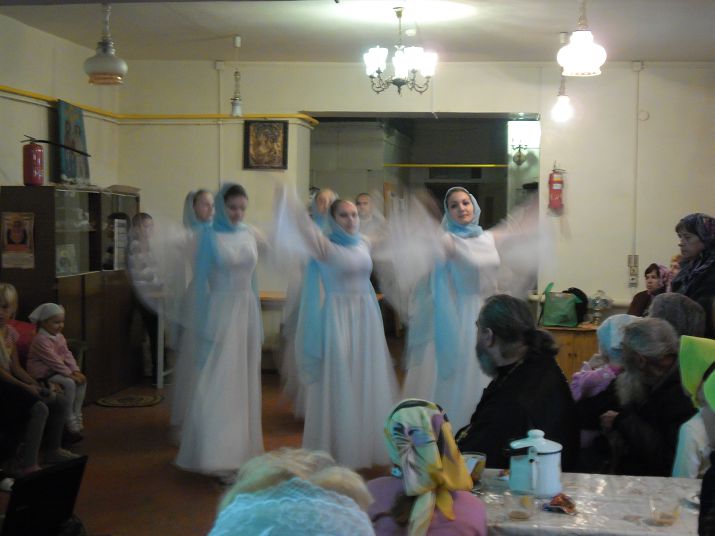 К поздравлениям с праздником от воспитанников воскресной школы присоединился народный ансамбль «Рашен данс» (руководитель В.А. Толстикова), показав прекрасные танцевальные композиции «Белым снегом» и «На Муромской дороге». В конце встречи все гости получили от детей поделки, цветы и гостинцы.