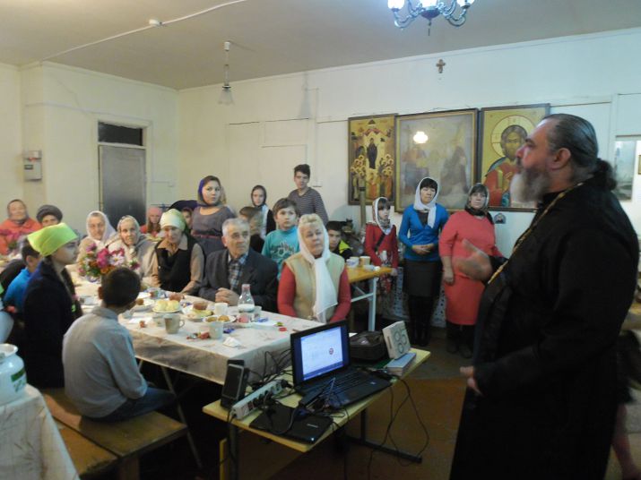 Все собравшиеся с интересом посмотрели презентацию с фотографиями старой церкви, разрушенной в 1961г., «церковной двадцатки» 1950-х и начала 2000-х годов, а затем фильм об освящении алтаря владыкой Леонтием (Бондарем) в 1994 году. Клирик храма Покрова Пресвятой Богородицы иеромонах Антоний (Ткачев) с болью говорил о тысячах невинных жертвах, подвергшихся репрессиям только лишь за исповедование веры.