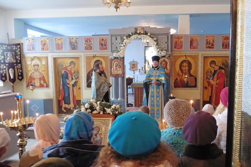В самый день праздника Божественную литургию совершили священники Максим Бражников, Алексий Атамасов, Григорий Сычев и Вячеслав Коротков. Проповедь перед Причастием произнес священник Григорий Сычев, клирик кафедрального собора святого великомученика Георгия Победоносца. В своем слове он отметил важность почитания Матери Божией как Заступницы рода христианского перед Богом и необходимость для чистоты сердца частого причащения Святых Христовых Таин.