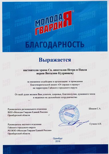 ГАЙ. 20 декабря 2016 г. Приход Петропавловского храма принимал участие в благотворительной акции «От сердца к сердцу», организатором которой выступило местное отделение «Молодой Гвардии Единой России».