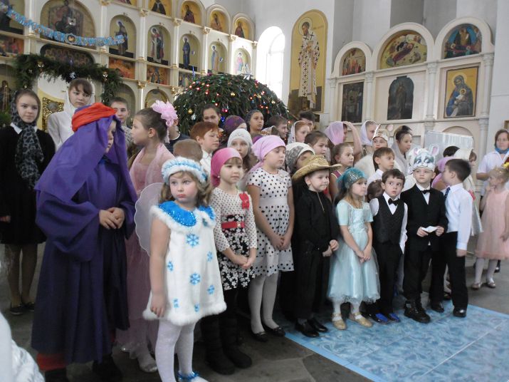 Затем ребята поставили три сценки: о двух вдовицах, помогающих погорельцам, о семейной паре Степаниде и Пахоме, впавших в грех осуждения и о лесных зверушках, ищущих Вифлеемскую звезду. Самым маленьким артистам едва исполнилось три года, но как все старались!