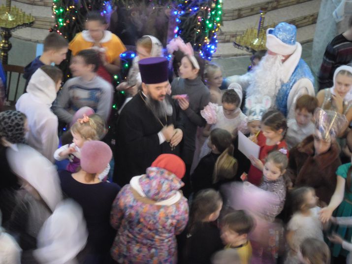 После пения праздничного тропаря, ребят поздравили с Рождеством Христовым традиционные сказочные персонажи Дед Мороз и Снегурочка, ребята читали стихи, пели песни – славили Родившегося Младенца Христа. Здесь и ангелы, и пастухи, и волхвы-звездочеты – все собрались вокруг украшенного гирляндами и звездочками вертепа.