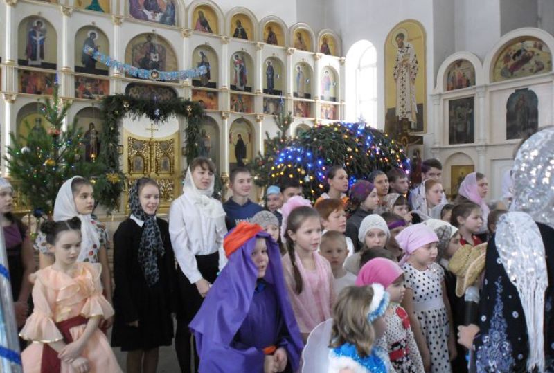 В полдень в храме яблоку было негде упасть: более двухсот мальчишек и девчонок, а также их мамы, папы, бабушки пришли на Рождественское представление, подготовленное воспитанниками воскресной школы Покровского храма.