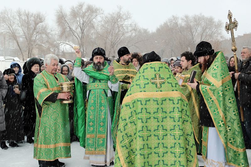 После Причастия был совершён крестный ход с иконами и хоругвями. Под праздничный звон колоколов и церковные песнопения прошли православные вокруг собора, отец Александр прочёл отрывки из Евангелия, а иерей Григорий Сычев окропил верующих святой водой.