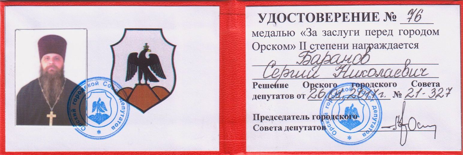 Во внимание к многолетним усердным трудам, достижения в общественной социально-культурной деятельности, значительному вкладу в воспитание подрастающего поколения секретарь Орской епархии, духовник Иверского женского монастыря г. Орска, протоиерей Сергий Баранов награжден медалью «За заслуги перед городом Орском» II степени.