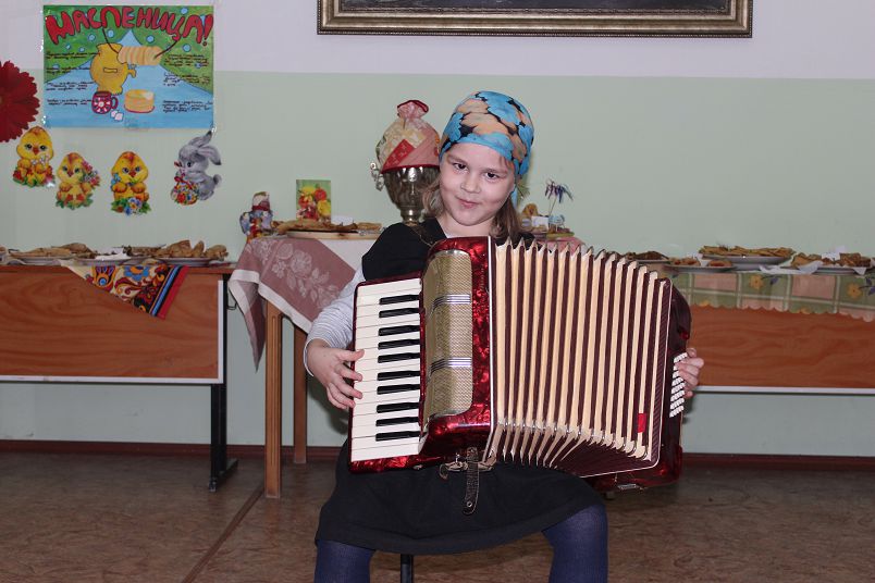 Начали праздник с песен, поговорок, весенних примет. Сразу трое деток из многодетной семьи Плотиков украсили торжество игрой на аккордеоне.