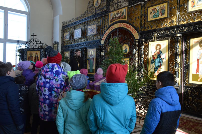 Ребят встретил благочинный Медногорского округа, настоятель храма иерей Максим Малюта. Священник провел для учеников экскурсию, рассказал об устройстве храма и основных особенностях изображения икон, их расположения в храме и на иконостасе. Во время встречи дети задавали вопросы о святых и православных праздниках.