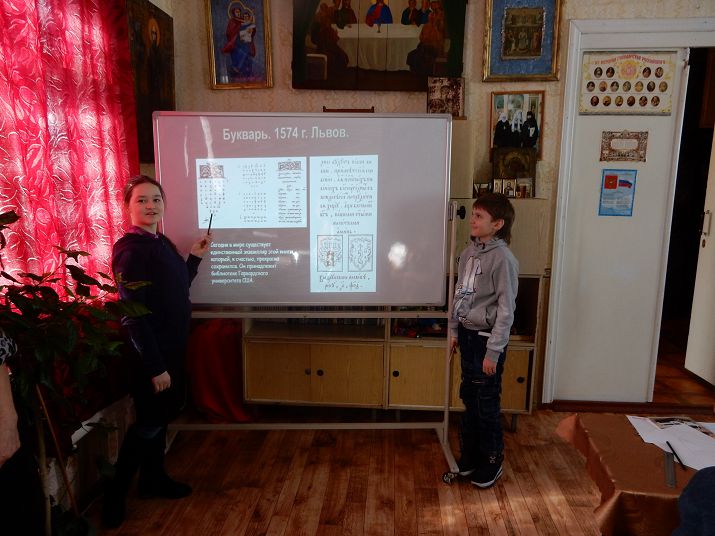 Преподаватель воскресной школы, Галина Николаевна Бобрусова рассказала об основателе книгопечатания в России – Иване Федорове, который 1 марта (ст. ст.) 1564 г. в Москве совместно с П. Мстиславцем выпустил первую русскую датированную книгу «Апостол». Тираж издания составил около 2000 экземпляров (сохранилось около 60). Текст «Апостола» был отредактирован и подготовлен к печати при участии митрополита Макария.