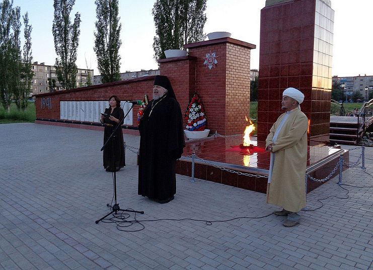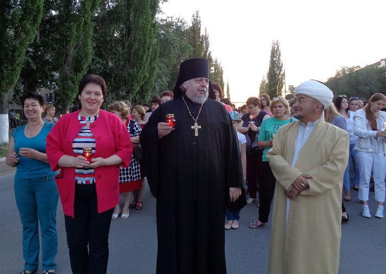 Православные и мусульмане, взрослые и дети несли свечи как знак единой скорби, единой благодарности ветеранам войны, единой ответственности за свою землю. Работники храма раздали более двухсот церковных свечей и много свечей-фонариков, чьи огоньки трепетали в вечереющем воздухе. Духовные песнопения, тихие слова молитвы сопровождали шествие, в котором было много молодых людей.