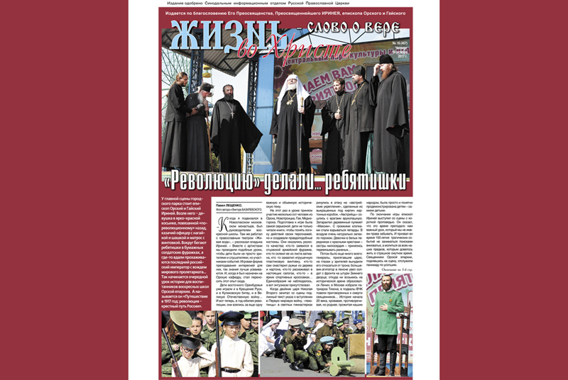По благословению епископа Орского и Гайского Иринея в городе прошел очередной игровой урок для воспитанников воскресных школ Восточного Оренбуржья «Путешествие в 1917 год: революция – крестный путь России». Текст репортажа, отзывы зрителей, многочисленные фотографии – все это ярко передает читателю атмосферу тревожных событий начала прошлого столетия.