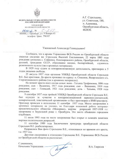 В советское время любые темы, связанные с судьбой людей, неугодных властям, находились под строжайшим запретом, с угрозой разделить участь страдальцев. Потомки репрессированных поколениями молча несли боль в своих сердцах. 5 ноября этого года Александр Стрельцов, житель Адамовки, рассказал о трагической судьбе своего деда Василия Емельяновича Стрельцова. Родился он в 1885 году, служил священником в Пономарёвском районе. Семья была большая: жена и пятеро детей. Первый арест в 1929 году привёл к пяти годам лагерного срока, за мнимую контрреволюционную деятельность. В 1937 г. – вновь арест. На этот раз за участие в «церковно-сектантской, монархической, повстанческой организации» приговорен к высшей мере наказания – расстрелу. Приговор приведён в исполнение 11 сентября 1937 года. О месте захоронения в Зауральной роще города Оренбурга родственники узнали только в конце 1990-х, благодаря поисковой работе историко-просветительского общества «Мемориал». С выпиской из архивов родственники получили небольшую фотографию – всё, что осталось от человека. С неё на нас смотрит не по годам состарившийся мужчина. На лице мы не видим страха. А глаза говорят: «Люди, помните о нас и никогда не повторяйте наших ошибок. Самая страшная беда для страны и её людей – это гражданская война».