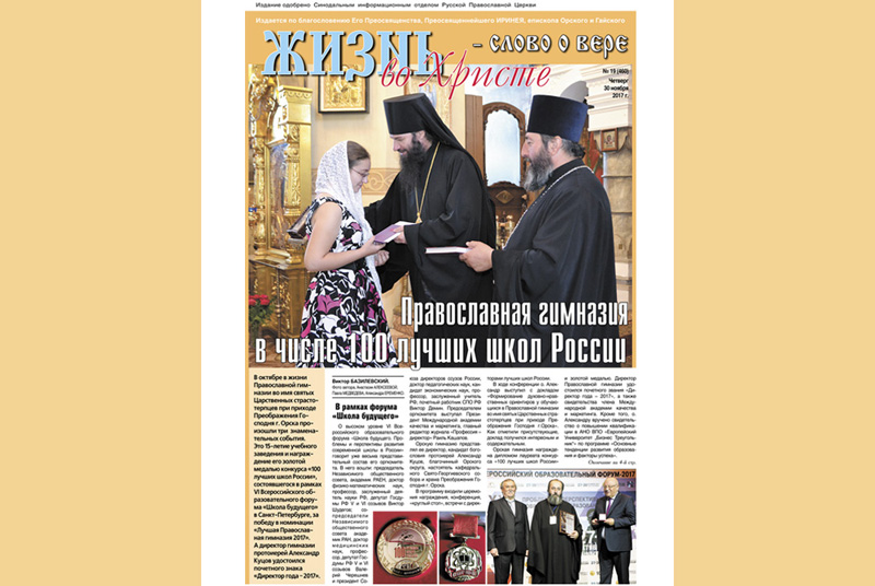 В октябре в жизни Православной гимназии во имя святых Царственных страстотерпцев при приходе Преображения Господня г. Орска произошли три знаменательных события. Это 15-летие учебного заведения и награждение его золотой медалью конкурса «100 лучших школ России», состоявшегося в рамках VI Всероссийского образовательного форума «Школа будущего» в Санкт-Петербурге, за победу в номинации «Лучшая Православная гимназия 2017». А директор гимназии протоиерей Александр Куцов удостоился почетного знака «Директор года – 2017». Об этом читайте материал Виктора Базилевского «Православная гимназия в числе 100 лучших школ России».