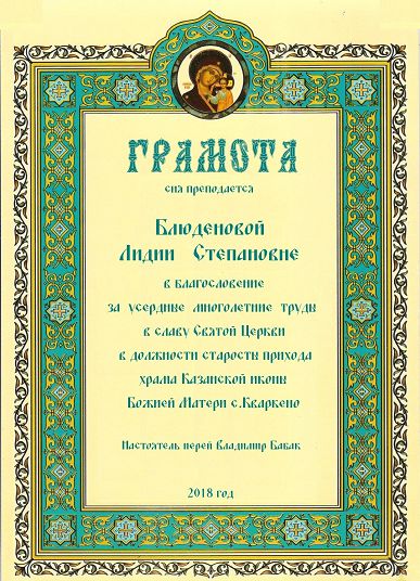Накануне Светлого дня прихожане храма Казанской иконы Божией Матери молились за богослужением Рождественского сочельника. В саму Рождественскую ночь в храме была совершена праздничная служба. По окончании Божественной литургии настоятель храма священник Владимир Бабак произнёс слова благодарности Л.С. Блюденовой, которая понесла немало трудов, исполняя обязанности старосты церковного прихода на протяжении 15 лет. Лидия Степановна отметила в ушедшем году 80-летие. В знак глубокой благодарности ей была вручена церковная грамота, цветы и памятные подарки.