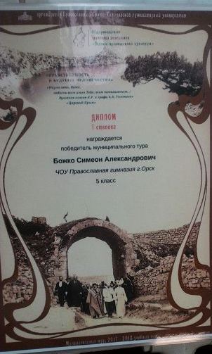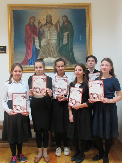 В муниципальном туре общероссийской олимпиады школьников «Основы православной культуры» на темы: «Нравственность и будущее человечества», «Научи меня, Боже, любить всем умом Тебя, всем помышлением» – духовная поэзия К.Р. и графа А.К. Толстого», «Царский Крым» принимали участие ученики 5-11 классов. Ребята показали отличные результаты – ни один ученик гимназии не остался без грамоты победителя или призёра. Отметим, что муниципальный тур проходил в Новотроицке еще в декабре и ребята долго ждали и переживали за результаты олимпиады. Однако, как оказалось, переживать было незачем: ученики оправдали надежды любящих педагогов. Итак, 1 место занял Симен Божко (5 класс); 2 место – Женя Минеев (7 класс), Аня Алексеева (7 класс), Витя Торопчин (7 класс), Толя Шелякин (6 класс), Катя Битюцкая (7 класс); 3 место заняли Андрей Кирилин (5 класс),Настя Тяжлова (5 класс), Георгий Баранов (6 класс), Маша Чернявская (6 класс), Саша Воробьев (5 класс), Злата Горбатова (5 класс), Оля Казарина (8 класс), Ваня Креслянский (8 класс), Арина Горбатова (8 класс), Ангелина Колотий (7 класс), Саша Цепляева (7 класс), Лада Цема (7 класс), Коля Гогалюк (6 класс), Рома Божко (6 класс), Вика Цембелюк (6 класс), Женя Коган (9 класс), Пантелеймон Филиппов (11 класс), Ваня Старченко ( 9 класс).