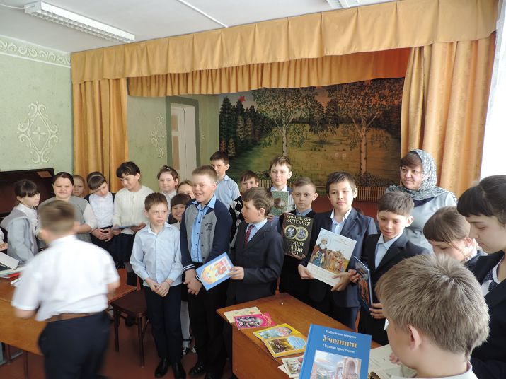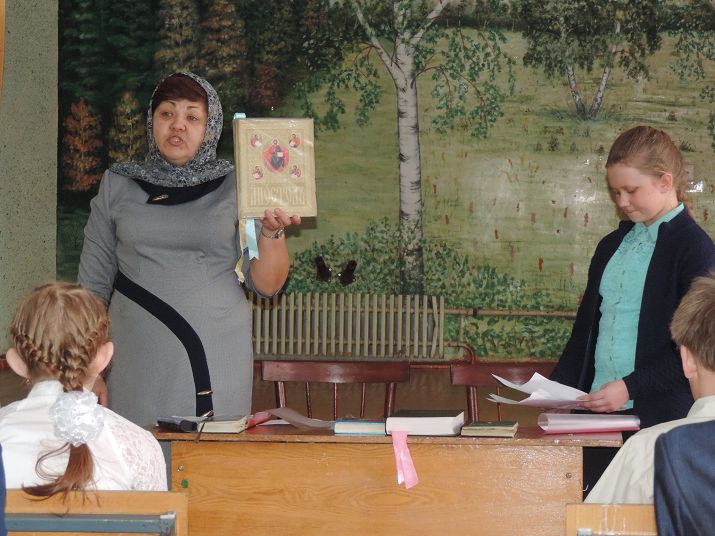ХАБАРНОЕ. 14 марта 2018 г. Руководитель воскресной школы храма святого апостола Андрея Первозванного Галина Николаевна Кригер провела встречу с учащимися общеобразовательной школы № 4 села Хабарного.